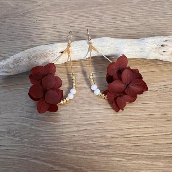 • Les boucles Fanette dévoilent de véritables pétales d’hortensias couleur bordeaux stabilisés suspendus à des créoles en forme de gouttes dorées.