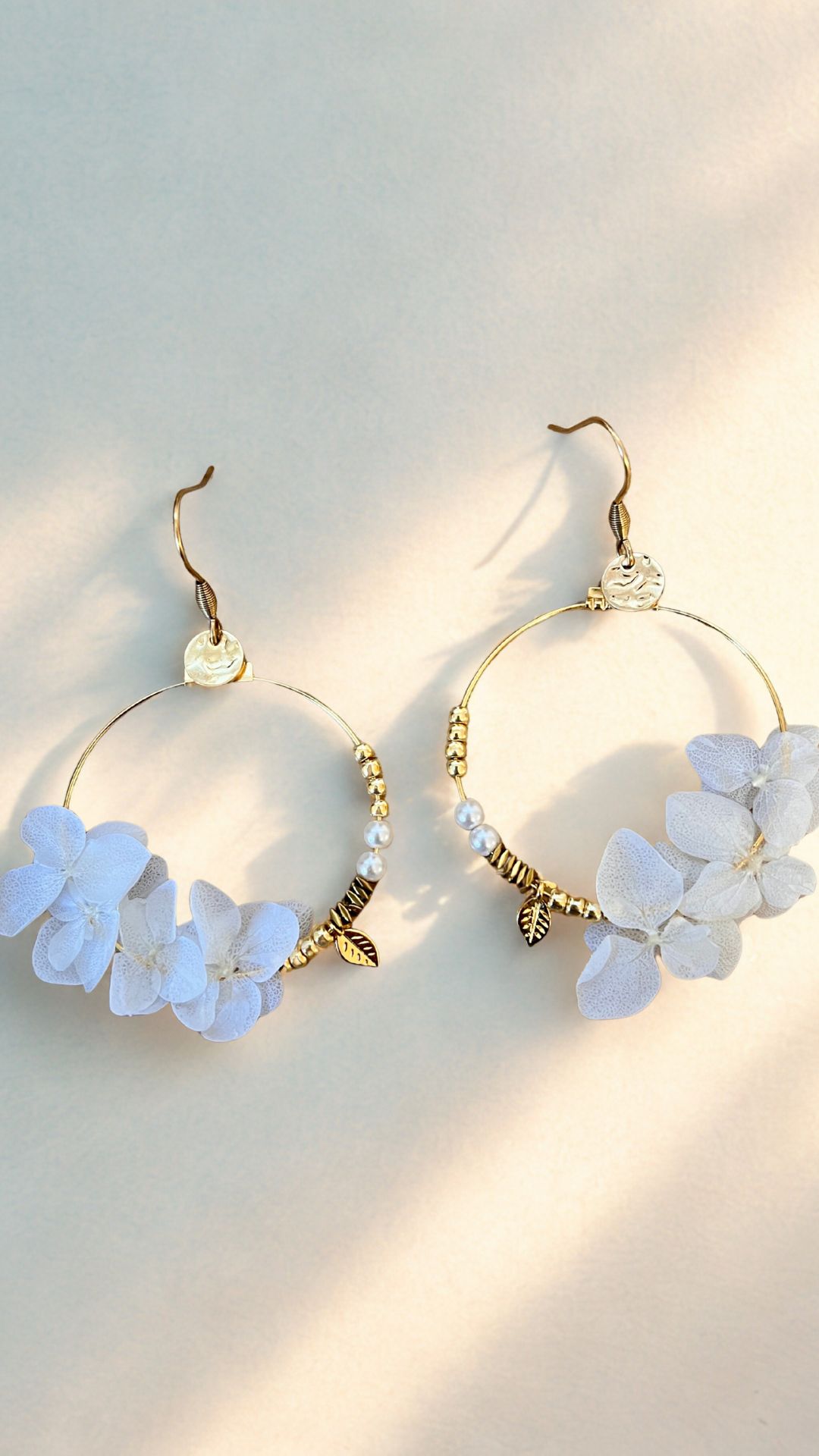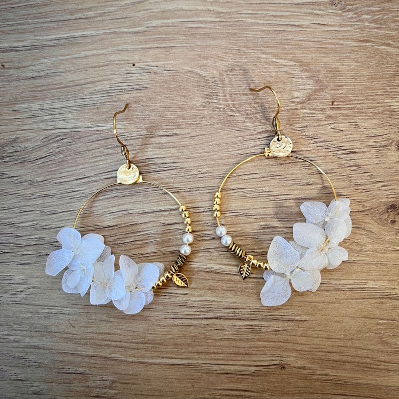 • Les boucles Lucie dévoilent de véritables pétales d’hortensias couleur blanche, stabilisés et suspendus à des créoles dorées avec de jolies petites breloques.