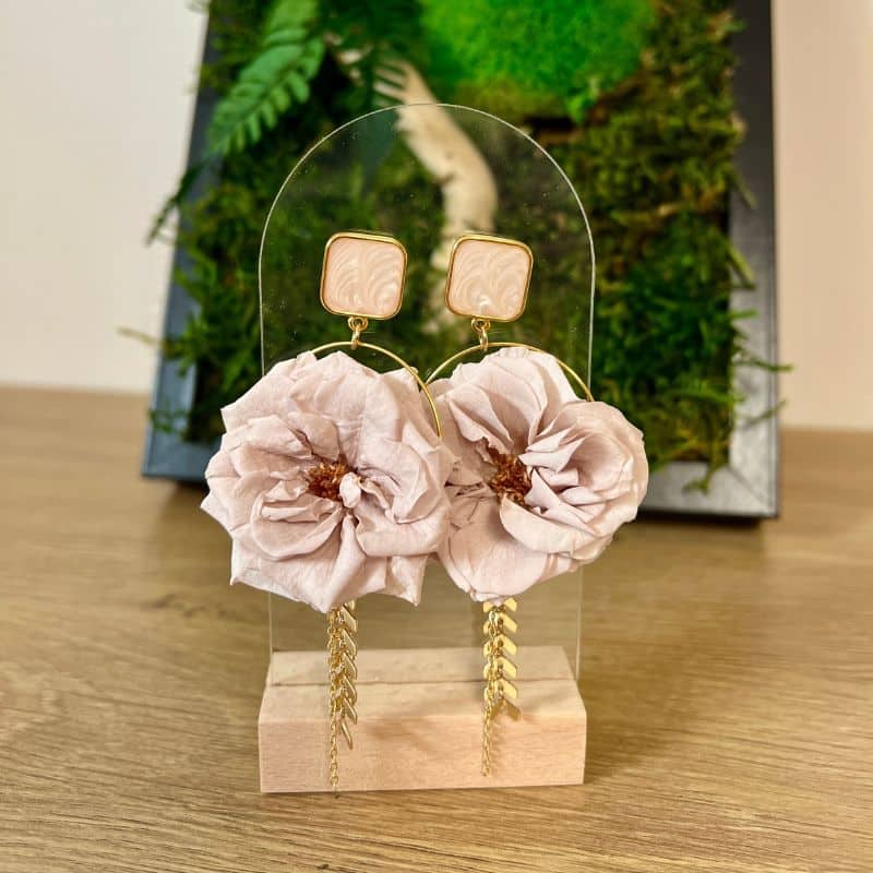 Offrez-vous un bout de nature éternelle avec les boucles d'oreilles Siloé, une création unique, parfaite pour celles qui souhaitent marier raffinement et naturel.Vous pouvez parfaire votre tenue avec la bague Goutte avec une rose stabilisée.