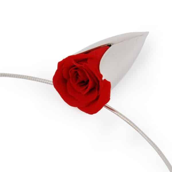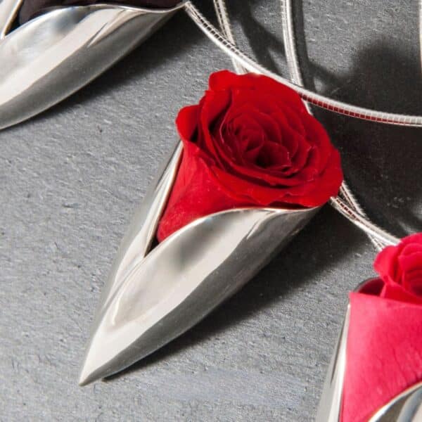 Pendentif romantique en argent 925 en forme de tulipe, avec une magnifique rose rouge naturelle, stabilisée et permanente.
