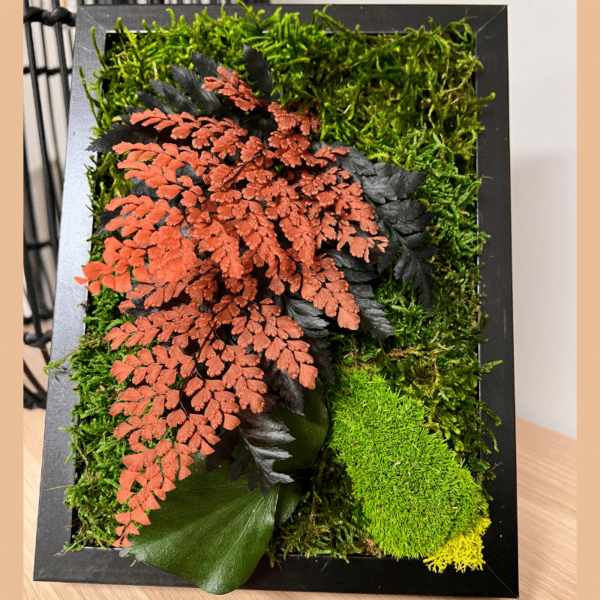 Description longueLe tableau végétal Miki met à l’honneur la fougère stabilisée dans des nuances automnales profondes.Ses teintes chaudes – entre brun, cuivre et nuances végétales – créent une ambiance réconfortante, naturelle et élégante. Une pièce idéale pour apporter du caractère et de la douceur à ta décoration.Son format 18x24 cm, associé à un contour noir, sublime la richesse des couleurs et des textures. Le cadre apporte une touche contemporaine qui équilibre parfaitement l’aspect organique du végétal. Une création artisanale unique.Chaque tableau est réalisé à la main dans mon atelier, à partir de végétaux naturels stabilisés. Cela garantit :
