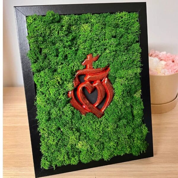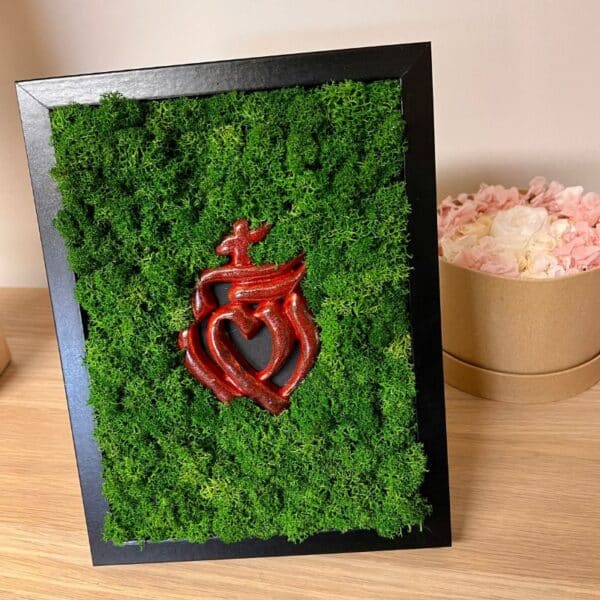Un hommage végétal à la Vendée : ce tableau végétal met en scène un cœur vendéen en céramique, façonné par un artisan local, entouré du lichen stabilisé soigneusement sélectionné.